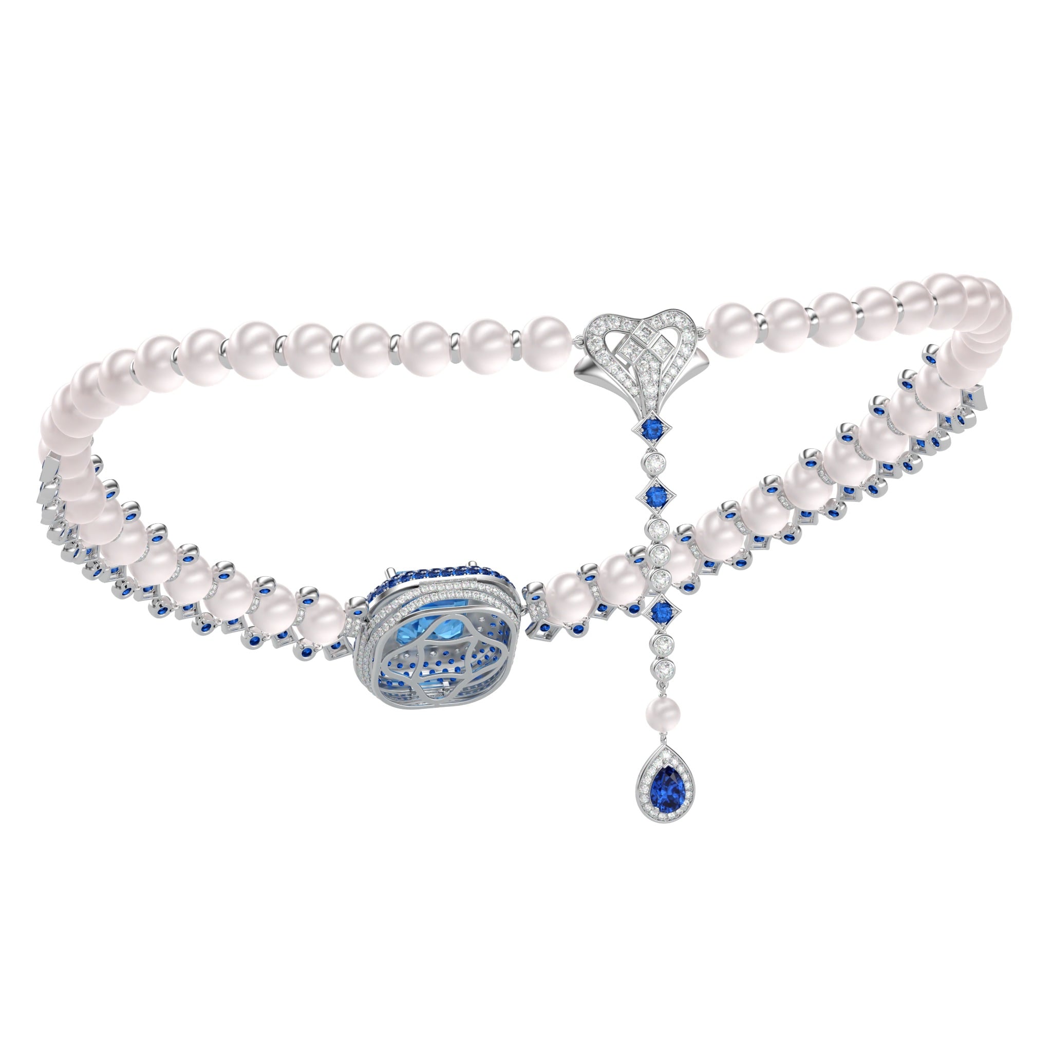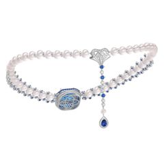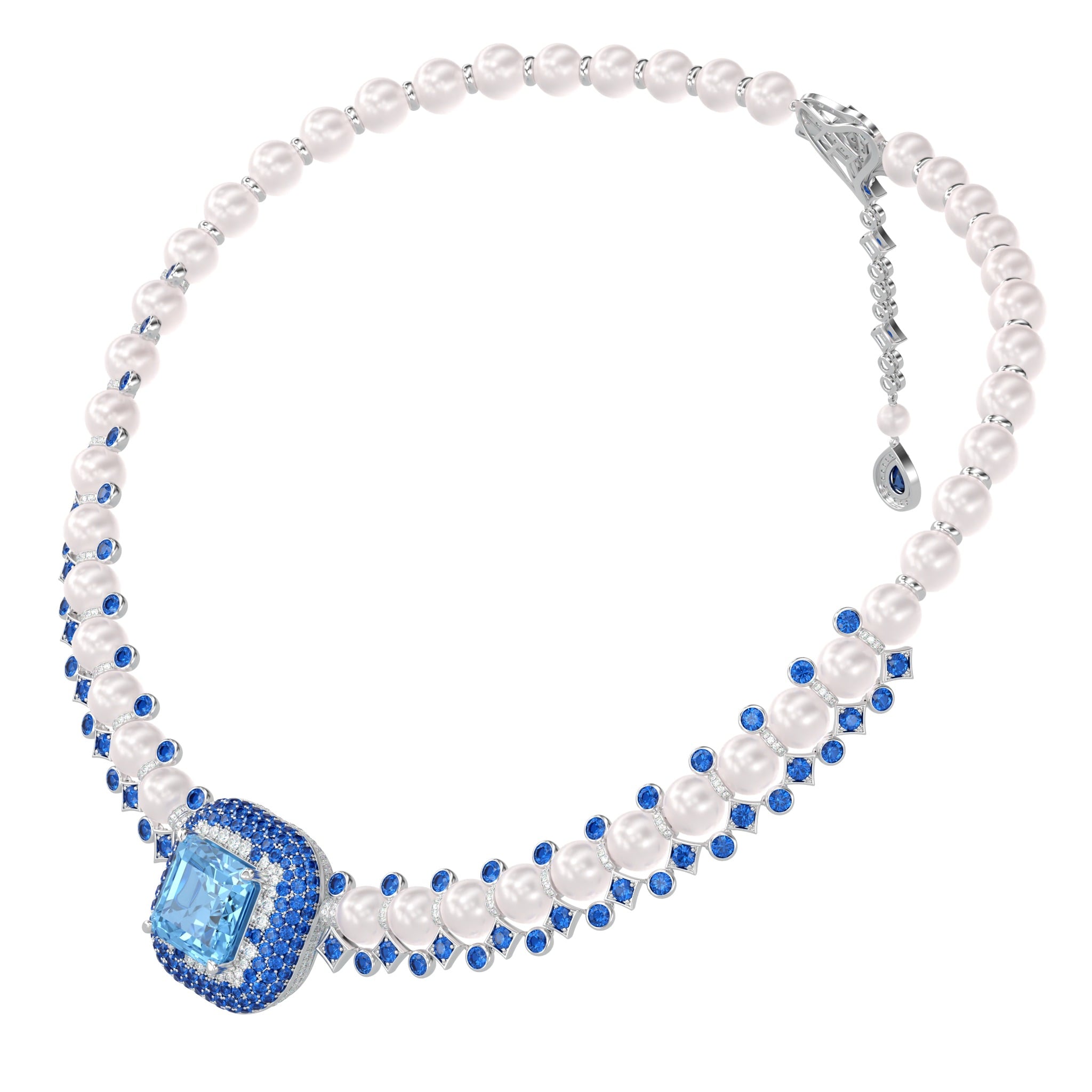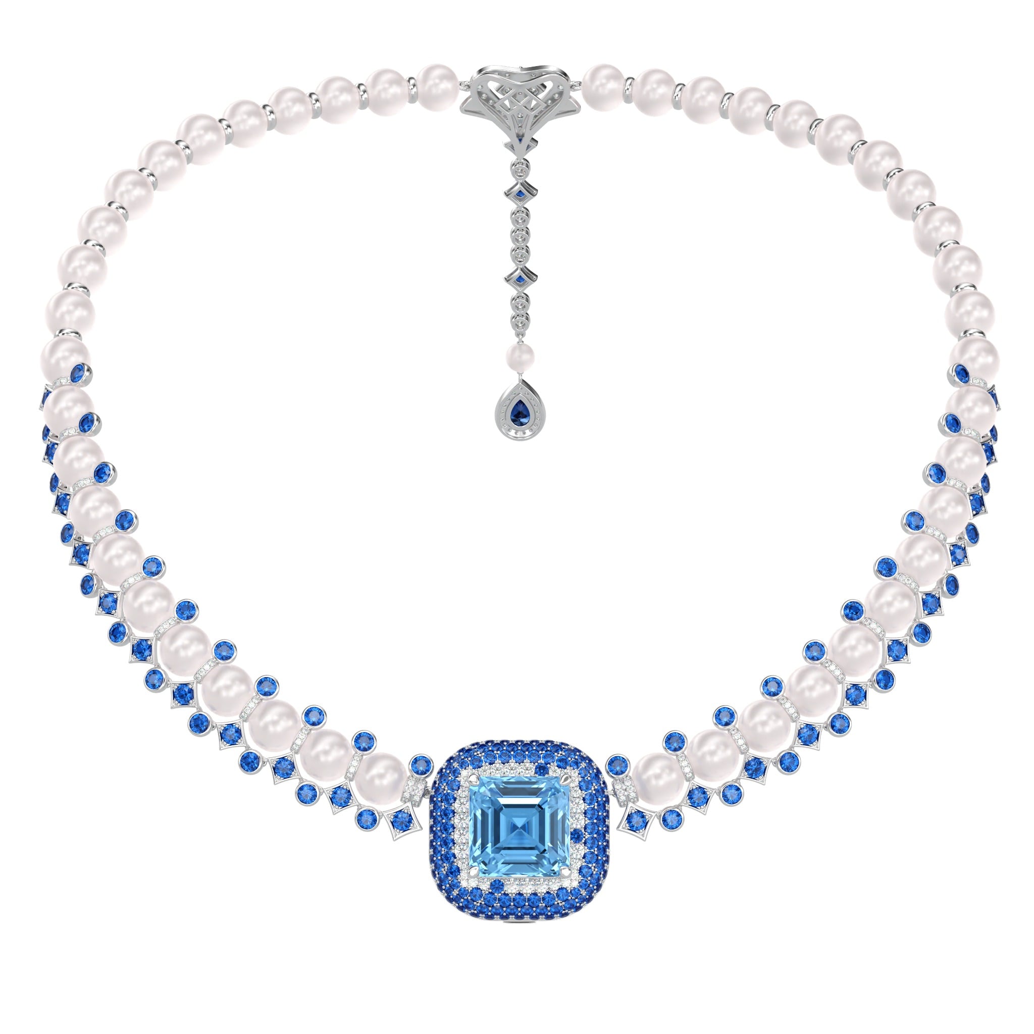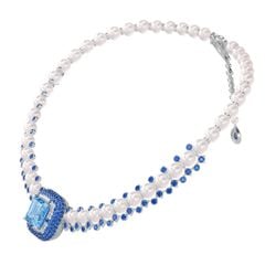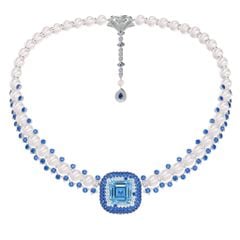 Vàng 18K | - 1 viên Aquamarine Vuông Blue 15 ly (Kiểm định PNJ) - 34 viên Ngọc trai Akoya Ball Trắng 8.0*8.5 ly - 10 viên Ngọc trai Akoya Ball Trắng 7.5*8.0 ly - 1 viên Ngọc trai Akoya Ball Light Pink 4.5*5.0 ly - 1 viên Sapphire Giọt Dark Blue 5.0*7.0 ly - 67 viên Sapphire Tròn Blue 3.0 ly - 103 viên Sapphire Tròn Mix Blue 2.0 ly - 16 viên Sapphire Tròn Mix Blue 1.5 ly - 3 viên Kim Cương Vuông 2.3 ly - 407 viên Kim Cương tròn từ 0.9 đến 2.5 ly |