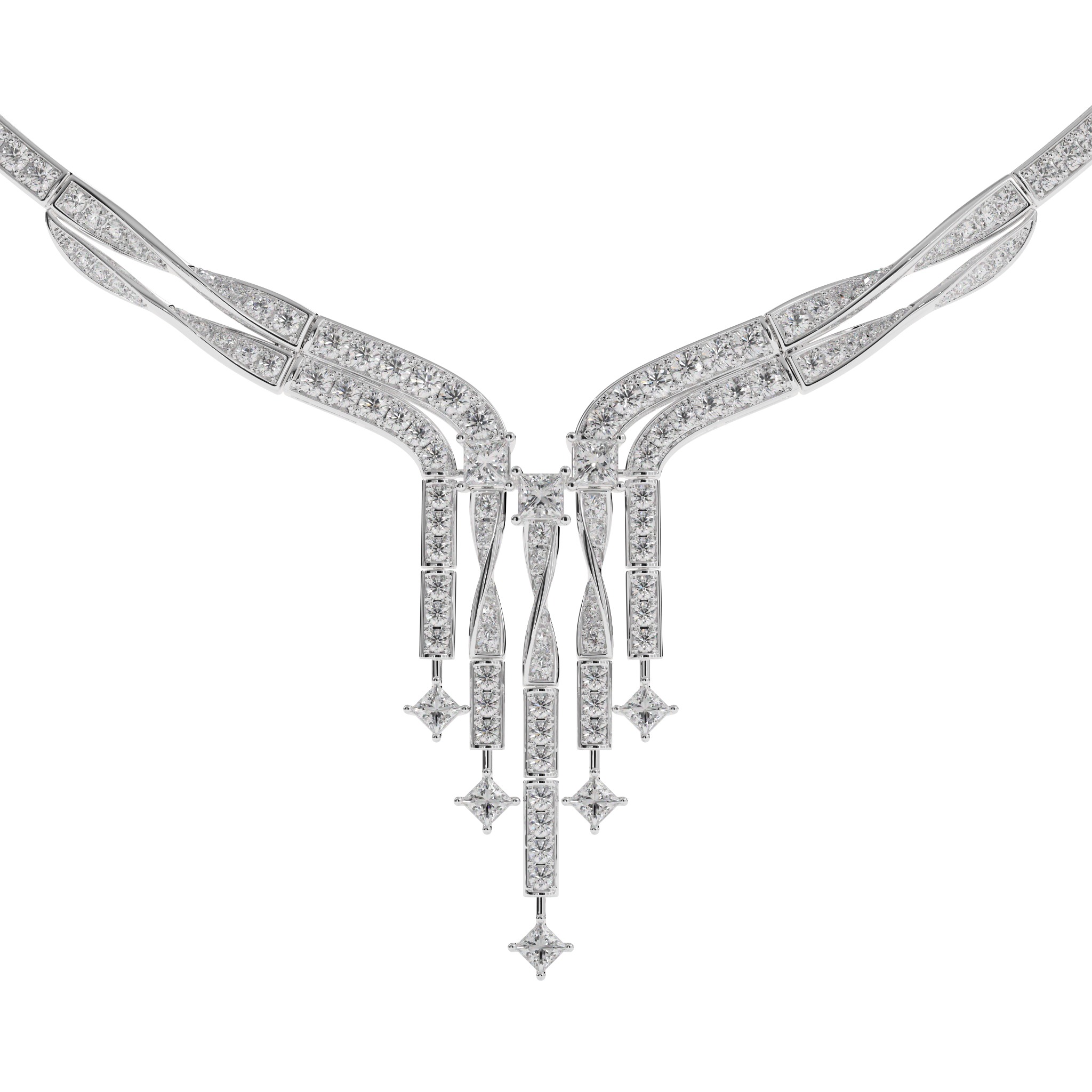 Vàng 18K | - 3 viên Kim cương vuông 3.0 ly - 5 viên Kim cương vuông 2.5 ly - 159 viên Kim cương tròn từ 1.0 đến 2.1 ly |