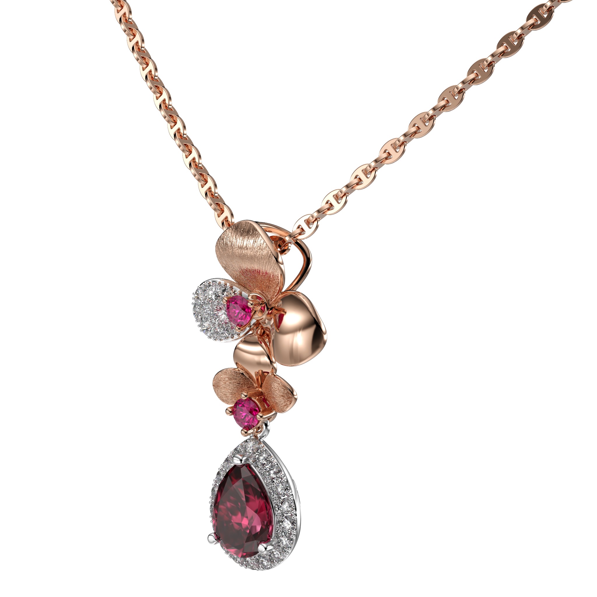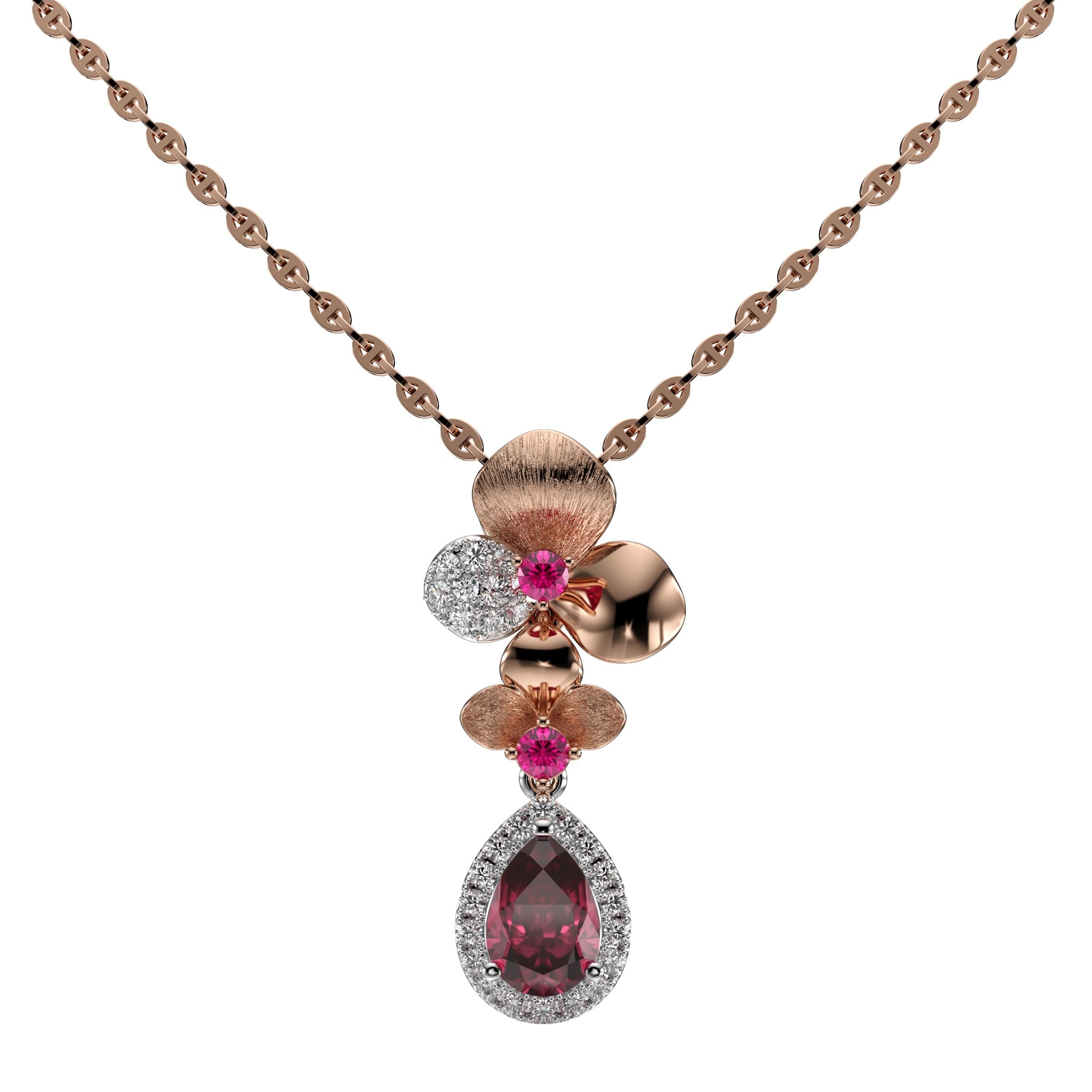 Vàng 18K | - 1 viên Tourmaline giọt hồng 4.5*6.5 ly - 2 viên Sapphire tròn hồng 2.0 ly - 27 viên Kim cương tròn 1.0 và 1.2 ly |