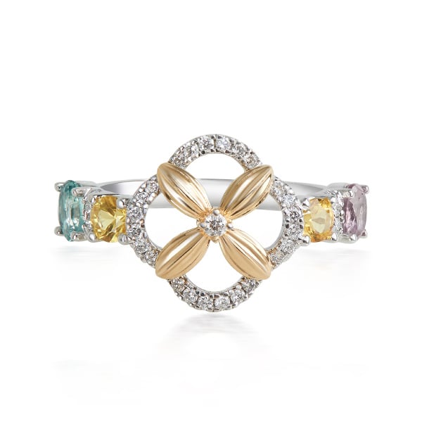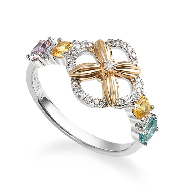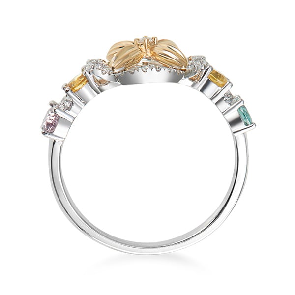 Vàng 18K | - 2 viên Tourmaline oval 3.0*4.0 ly - 2 viên Sapphỉe tròn 3.0 ly - 33 viên Kim cương tròn 1.0 và 1.5 ly |