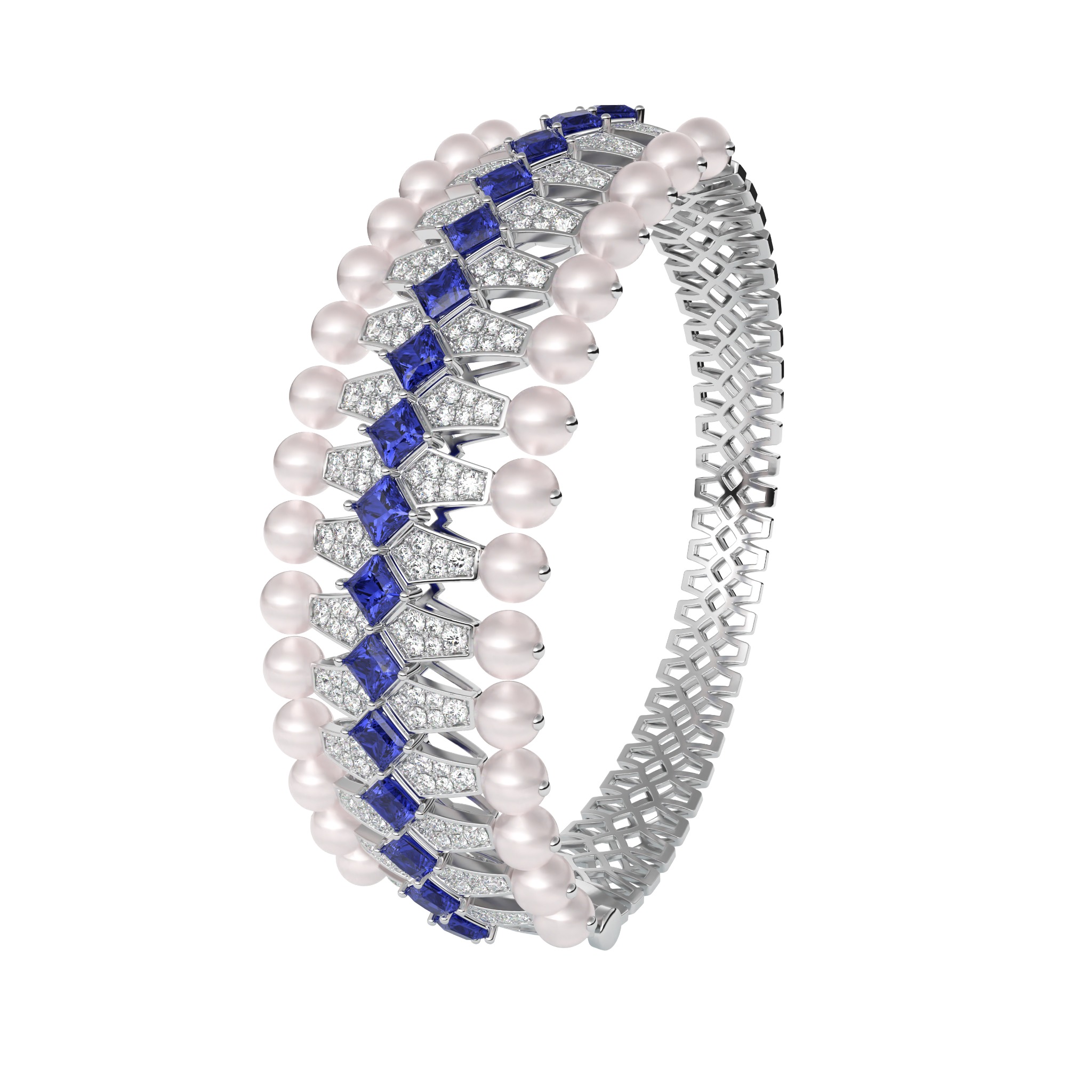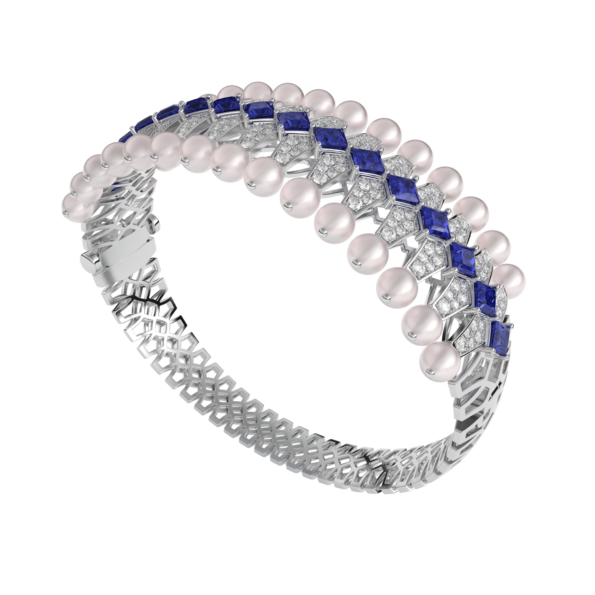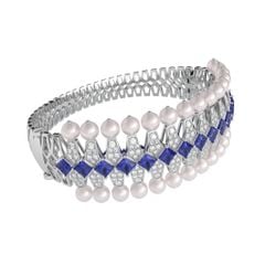 Vàng 18K | - 30 viên Ngọc trai Akoya Ball Light Pink 3.5*4.0 ly - 16 viên Sapphire Vuông Mix Blue 3.0 ly - 180 viên Kim Cương tròn từ 1.0 đến 1.4 ly |